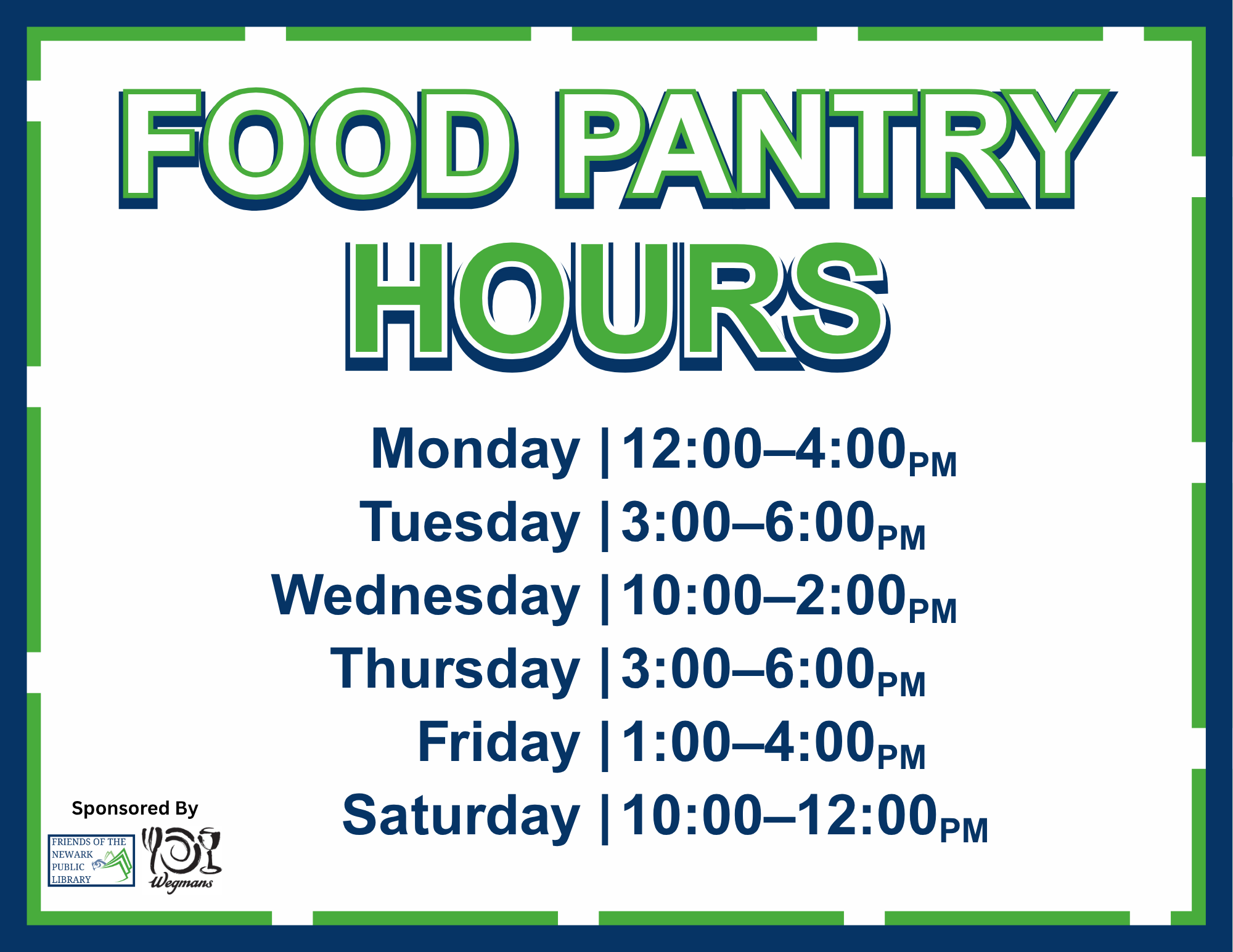 The Newark Public Library is offering a new program for the community! The Pantry @ Newark Public Library is sponsored by The Friends of the Newark Public Library, Foodlink and Wegmans. At this time we are offering dried food, canned food and some personal items – generally one of each item per household.